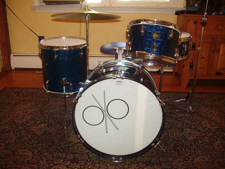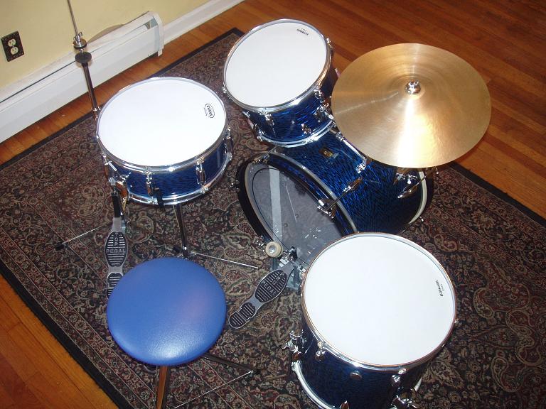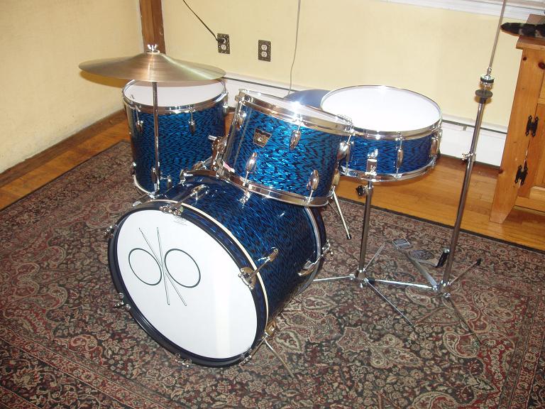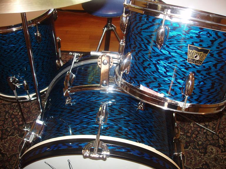Hey guys, I'm finished with the blue Majestic kit and I have to sell it. I'll be putting it up on Craigslist for $350. but if a forum member wants them I'd do 300. The only thing is this is a pick up only in CT.For you guys who followed my posts, you know how many man hours went into re-habbing this kit. This kit is in amazing condition with absolutely no rust and only some minor pitting in the chrome. Original kick pedal, hi hat stand and the front bass head, tom head and FT head are virgin originals rescued from the bottoms. The snare has new heads top and bottom, new head on the bottom of the tom and an almost new Remo Pinstripe clear on the beater side of the bass. every screw, washer etc, removed and cleaned. All chrome removed, cleaned and polished. The metal bass hoops removed, wrap removed, sanded, primed and painted and the inlays reinstalled. The wrap has no rips, tears and is tight with very few minor nicks. These drums with the original muffler strips sound like studio drums. The cymbal looks fantastic although does not sound that great. I put it with the kit to keep it all original. Even the throne is original that I recovered in blue. Here's some pics. The kit looks even better in person..Rich.