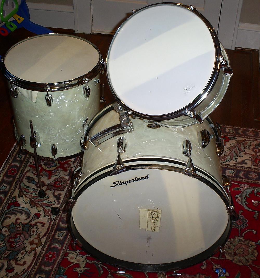 Just purchased this 64 Slingerland set in WMP. 12, 14, and 20 with a 14x5 COB Snare. SUper heavy set with all COB hoops. No badges on floor tom and rack tom, is that right? The snare has a rapid stainer and the badge is missing. (is that right or is that a patch job) Came with Ludwig Standard cymbals and 18" and a set of 16" Hi Hats. (is that possible) Seems too clean was it a good find or am I not seeing something.