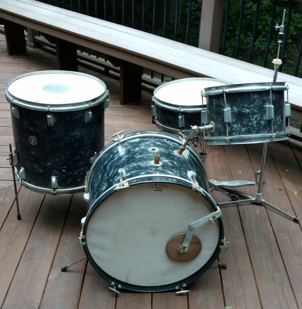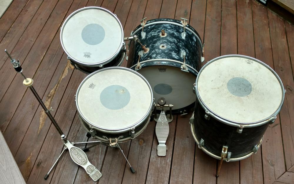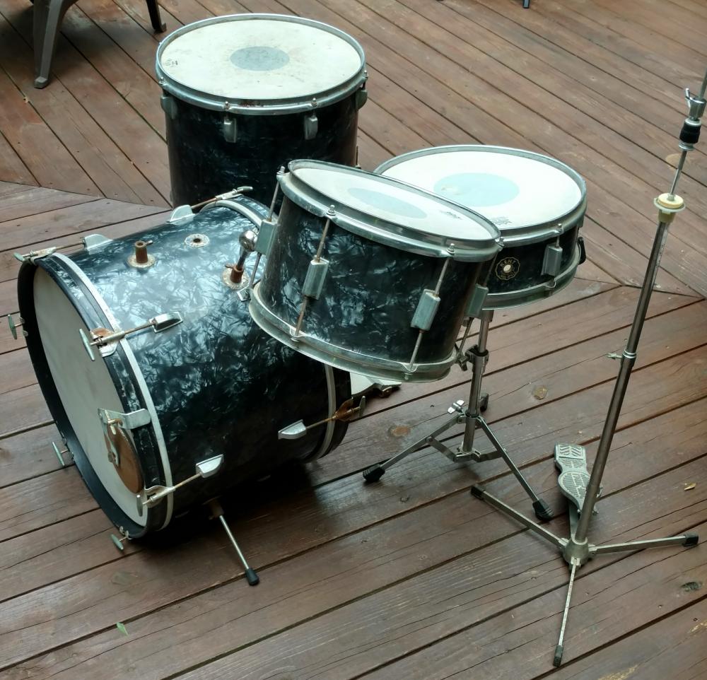 '66 Kent drums in Black Diamond Pearl - 20" Bass Drum, 16" Floor Tom, 12" tom tom, 14" snare drum, (2)Kent foot pedals, MIJ Hi hat stand, Rogers BD muffler. A real Barn Find, drums need complete restoration/cleaning, but afterwards would be a nice set. 2 ply maple toms/snare, 6 ply BD. All of the bottom heads are original! Floor tom has Nov. 29 1966 date stamp.Some minor issues with a kit this old, nothing major.
