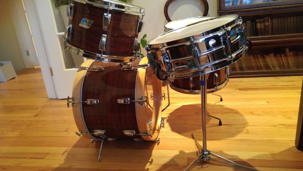 For sale is a hard to find complete mid 70’s Ludwig Jazzette kit, with the rare 12”x18” bass drum and original serial matched Supraphonic snare. The kit is the configuration shown in the 1975 catalog (http://www.vintagedrumguide.com/jazzette.html) right down to the mahogany cortex finish . I obtained the kit from the second owner, who said it has been stored for most of the last 20 years. I do have the hi hat stand and snare stand that came with the kit, but they are in rough shape, and probably not worth shipping. They could be included if a buyer really wants them.