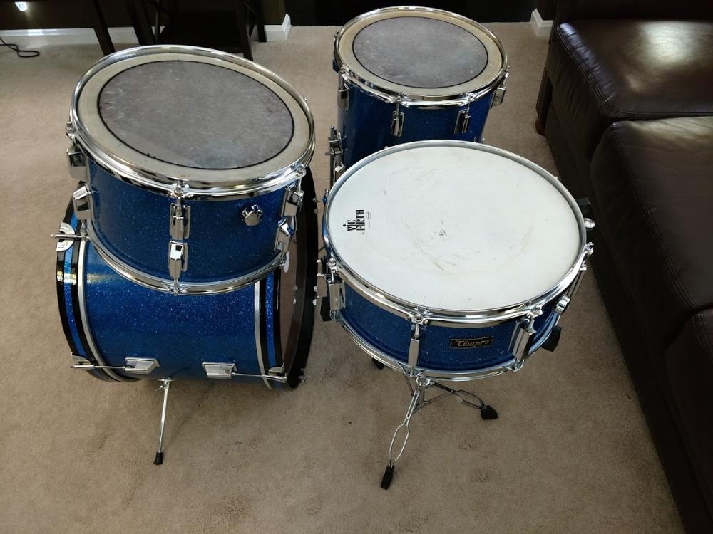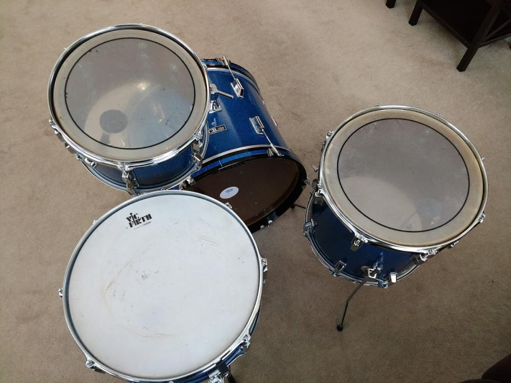 I also have the 9" x 13" rack tom that matches the kit (not shown in the pictures), along with the factory arm (shown in the bass drum). I'm going to include it as a "throw in", but it is missing the hoops, heads, tension rods and internal tone control, and there is a large crack in the wrap. It can still be used as is or re-wrapped if you want (again, modern blue glitter matches perfectly), but I will include it with the sale.