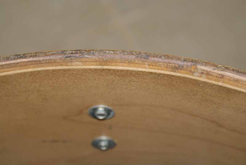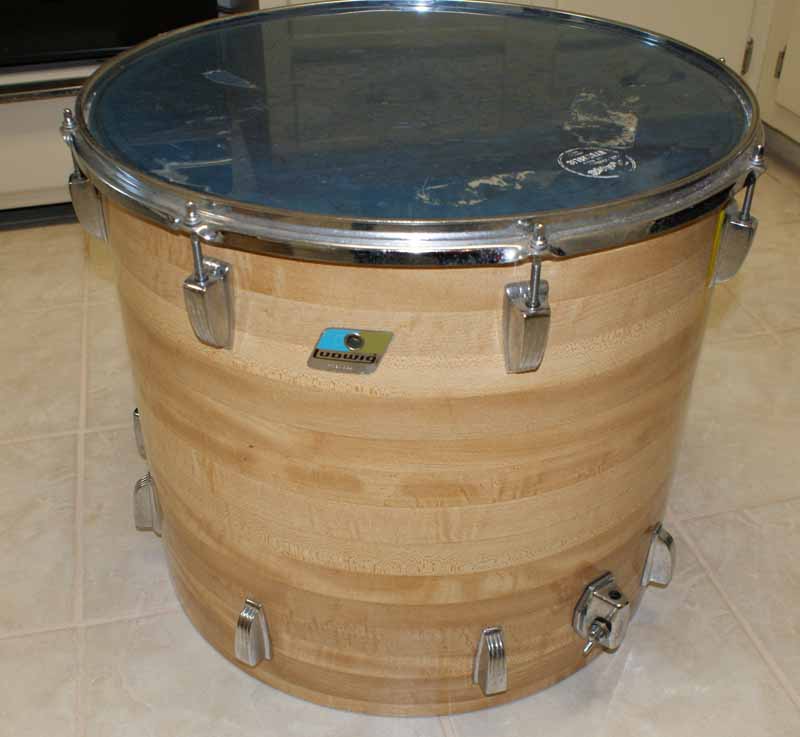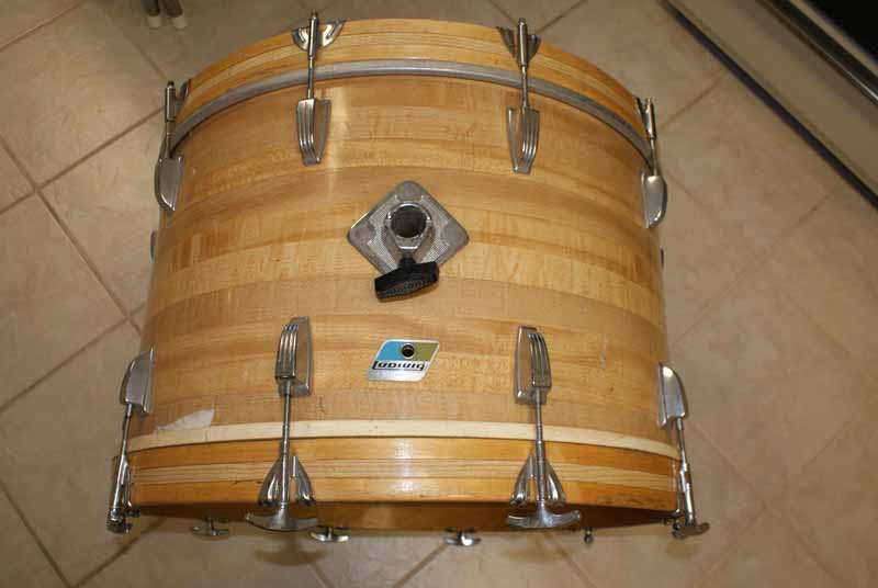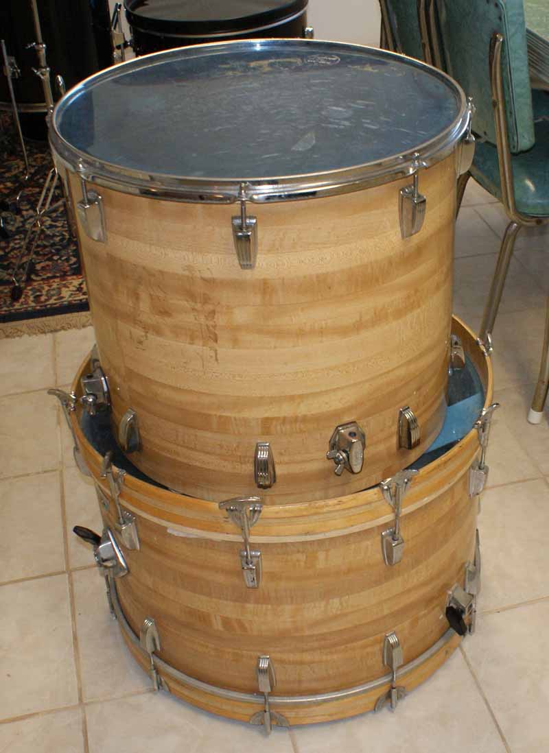 I bought these two drums the other day. I know they are from the eighties but that's about it. I love the ugliness of the butcher block cortex and I'm really excited about the sizes. Several problems though. I'm missing the spurs and the Ludwig curved spurs from the 70s don't seem to fit. (not fat enough). I'm also missing the bottom floor tom rim. Any help on locating a 20" hoop. I'd like help with a date, spur info and maybe other sizes that would have gone with this set. I'm not really looking to complete the set because I like the minimalist thing but some info on the tom mount would be useful.