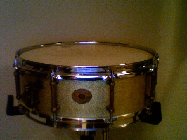 I just picked up 2 snares the other day, and I did my internet research on them. One of them is a really old Slingerland. It was originally a Tone Flange snare, but the flange was removed and the edges were re-cut. It is single-ply mahogany, has the "First Tan and Brass Cloud Chicago" badge, and it is wrapped in the gold sparkle that looks like sand. The tube lugs are brass, and the throw-off is original and working (with a little bit of "jiggling" required, but it's worth it, I think). It's VERY sensitive and has a wide tuning range that sounds pretty great all the way through.