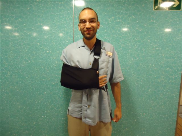 Mid week during the cruise while whaling away on a drum solo on a rendition of a Michael Jackson hit song, while down in the orchestra pit, Josh pulled a tendon in right arm. A re-injury from an old sports mishap from ten years back. Josh now unable to play his drums, was out of the show and had to break his contract with the ship's cruise line and worse, sit out the remaining week as a passenger. I took this photo as Josh was disembarking the Ship to get an MRI on his arm and fly back to New York to recuperate.