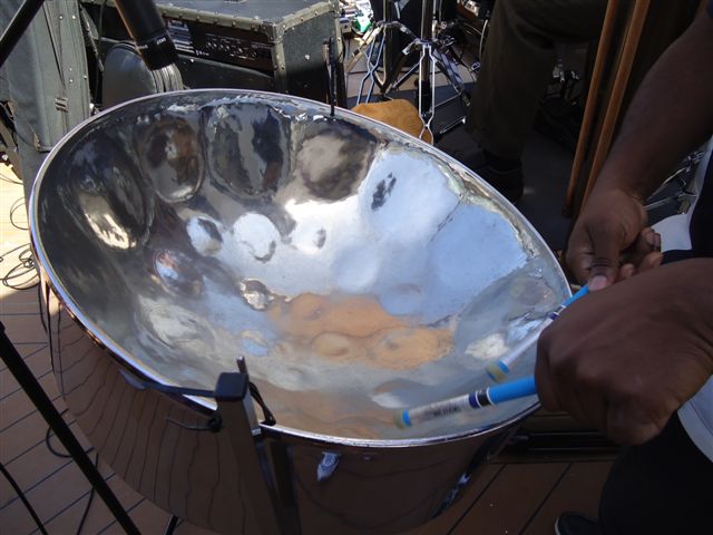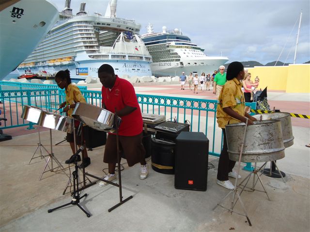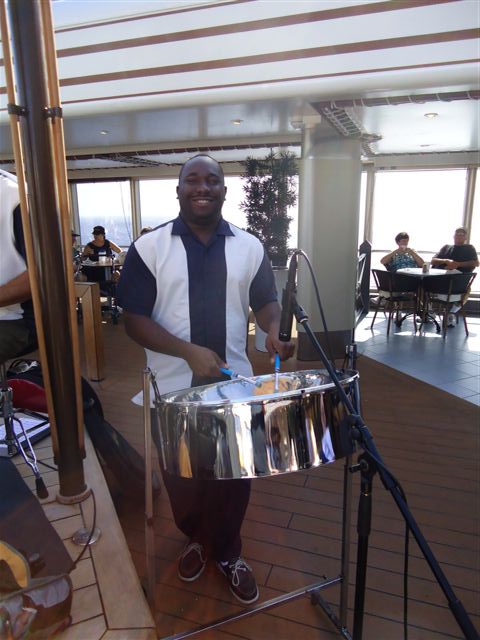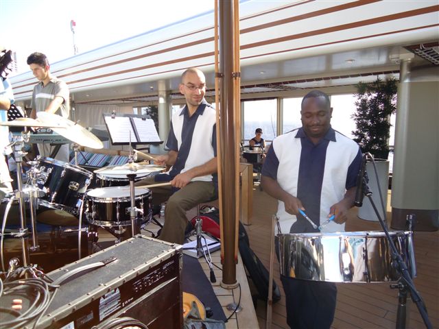 I met two terrific professional drummer musicians this past week on a Mediterranean Sea Cruise to Sint Maarten. Joshua McEwen from New York City and 'Junior' a top notch Steal drummer from Trinidad. They played informal pop hits poolside during the day time hours and performed a rigorous schedule in a large show room at the ship's main ballroom every night playing every genre of music and most all was read from the charts. A typical workday was five to eights hours of performing daily in various areas of the ship for seven consecutive days.