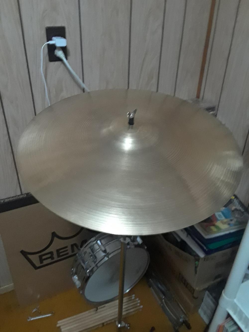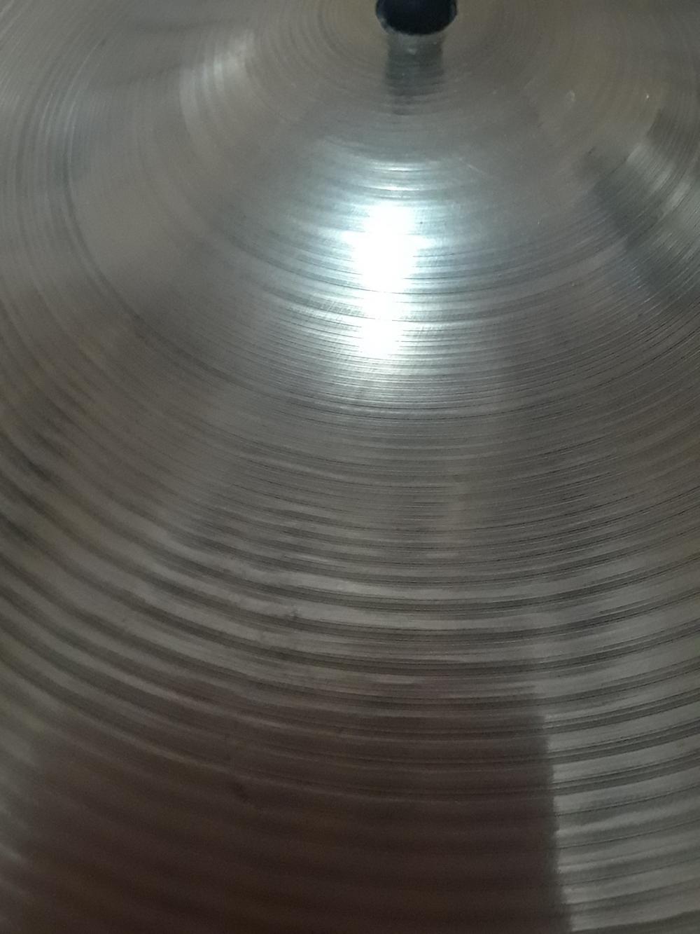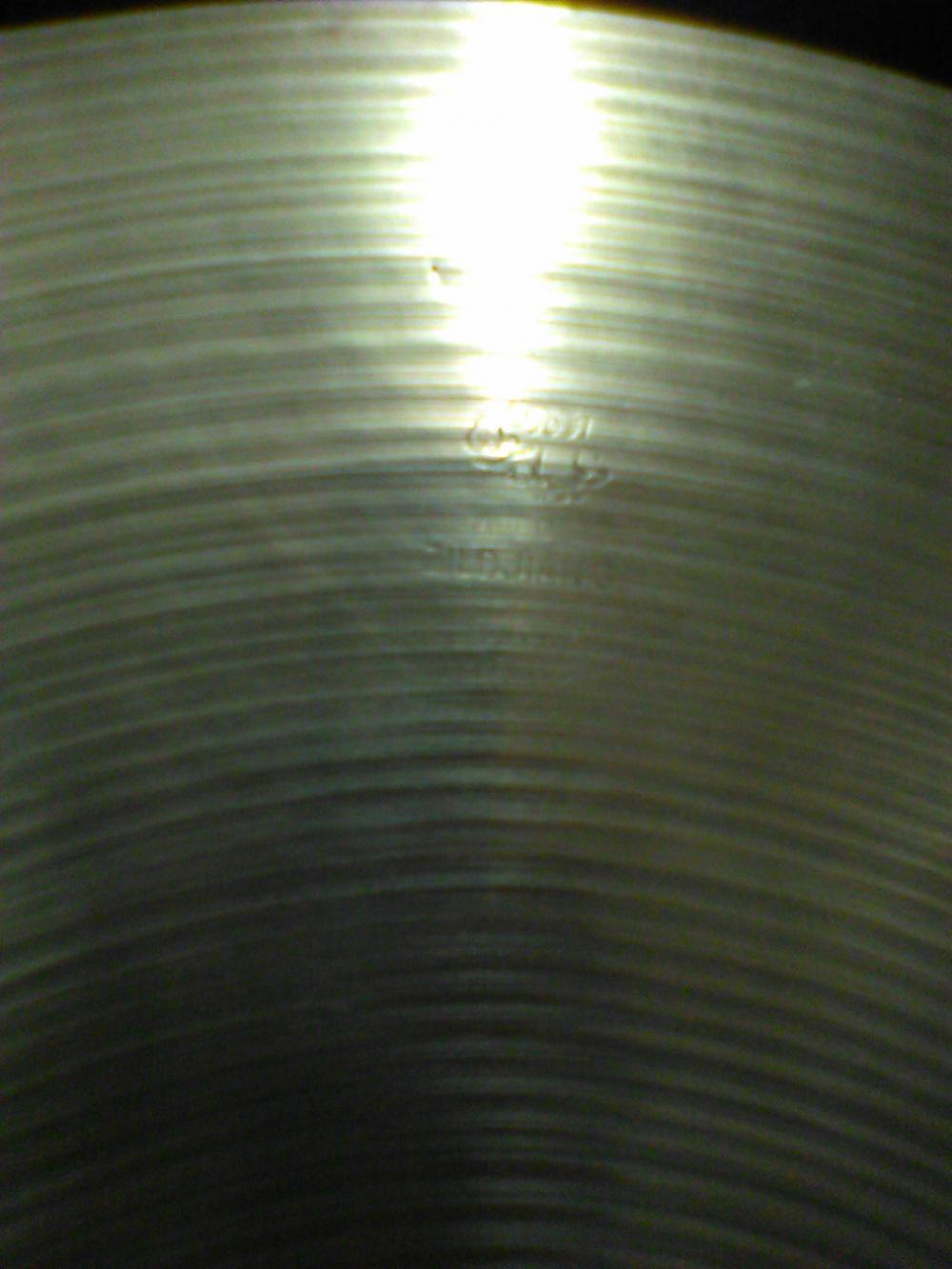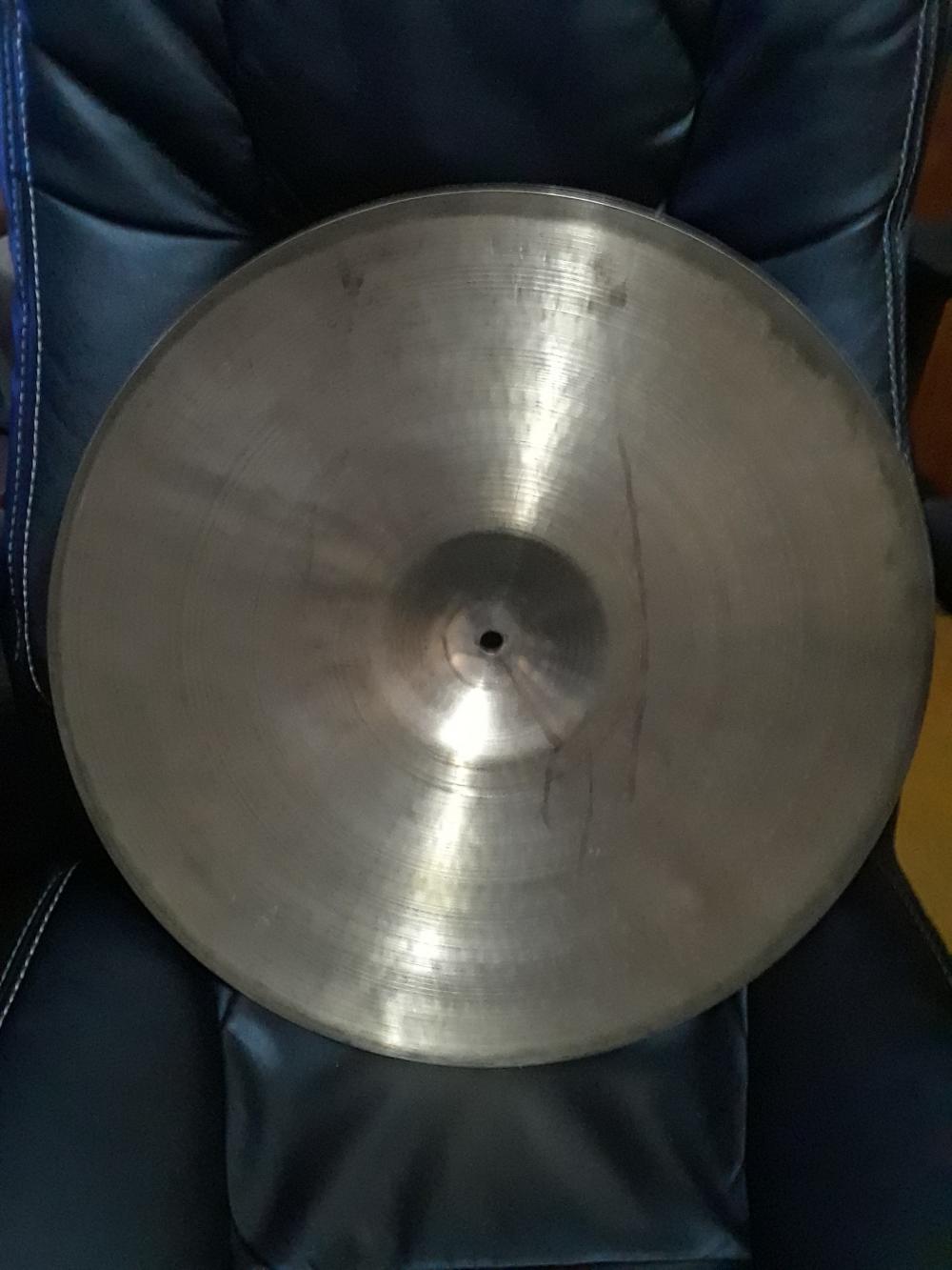 18" med thin crash, 1432g, late 50's small stamp. Dark sounding crash with nice wash. Has a small keyhole, some very minor edge nicks but edges are still smooth and stains on underside. It has some large hammering near bell.