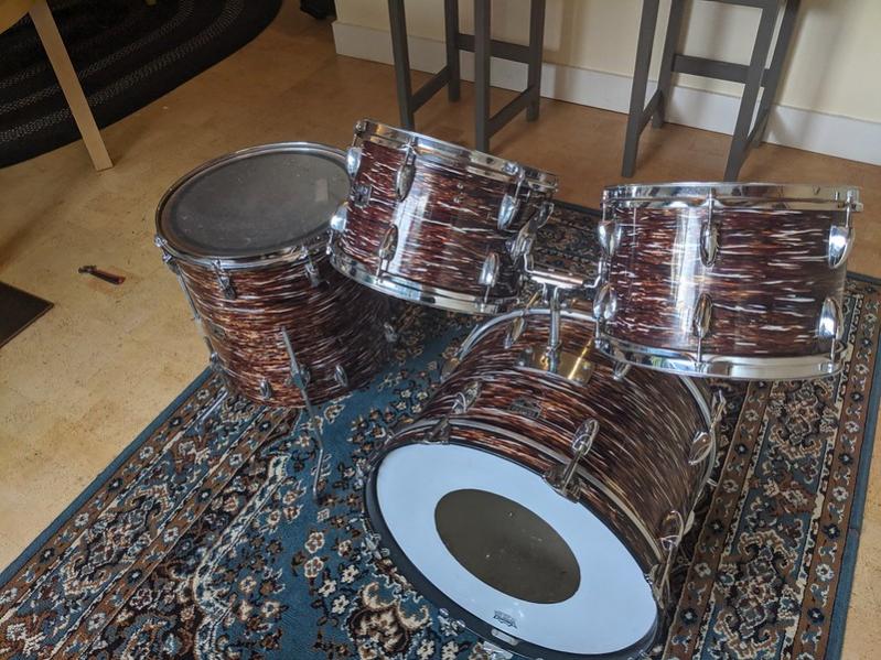 Any vintage Yamaha experts in the crowd? Have I got a million questions for you! I picked up what I'm 90% sure is a Yamaha DT-225 set in brown willow pearl from late 60s/early 70s, in pretty great condition all things considered. Two 12" mounted toms, a 16" floor, and a 20" bass with wood hoops. Not a museum piece, and there's a couple missing screws and the floor tom is missing its reso hoop. Someone also drilled one of the 12" toms for a new tom mount, but at least the original mounting plate covers the new holes.