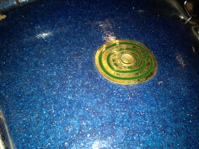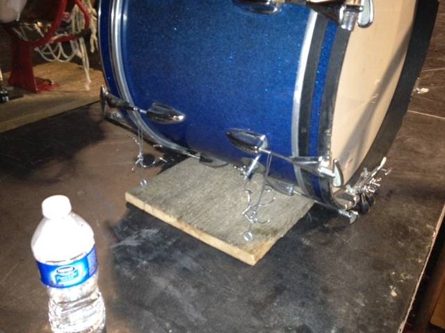 The kick drum apparently belongs in the non USA section as it is clearly an MIJ of some sort. "Gambler Import Corp." is what it says on the badge. I am not familiar with those, but am no expert either. He didn't have spurs for it. (By the way, what the heck happens to all of those spurs? They are almost as likely to be missing as a bottom hoop and tension rods on a tom or the front hoop and T rods on a kick drum. I think people have just misunderstood the term "disappearing " spurs. But I digress.) Since he did not have spurs he opted to put the kick drum on a piece of plywood and then wire it to the tension rods. Why not? The T rods are actually pretty cool with the "T" being somewhat of an asymmetrical tear-drop shape.