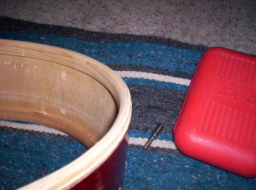 So this little guy is from the proceeds of my sale of the Acrolite. A 5 ply shell with reinforcing rings, Star Breadloaf lugs and Sticksaver hoops. The strainer is gone, so it is getting a Pearl P-85 style. It also had a hideous red sparkle, very strange wrap. This looked like a silver that had been overlaid, but turned out to be multi-layer of base silver glitter, and then a red clear coat over that. It was pretty messed up, so I stripped it in favor of the remaining slice of Curly Maple. I know, I know, I said earlier it is a BE maple, but you know what, I'm getting old, and my brain is like a seive...Anyway, see the pix for the beginnings of the next train wreck...
