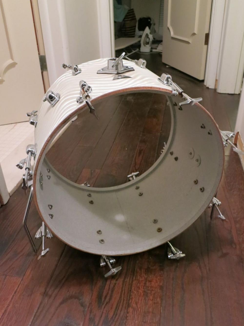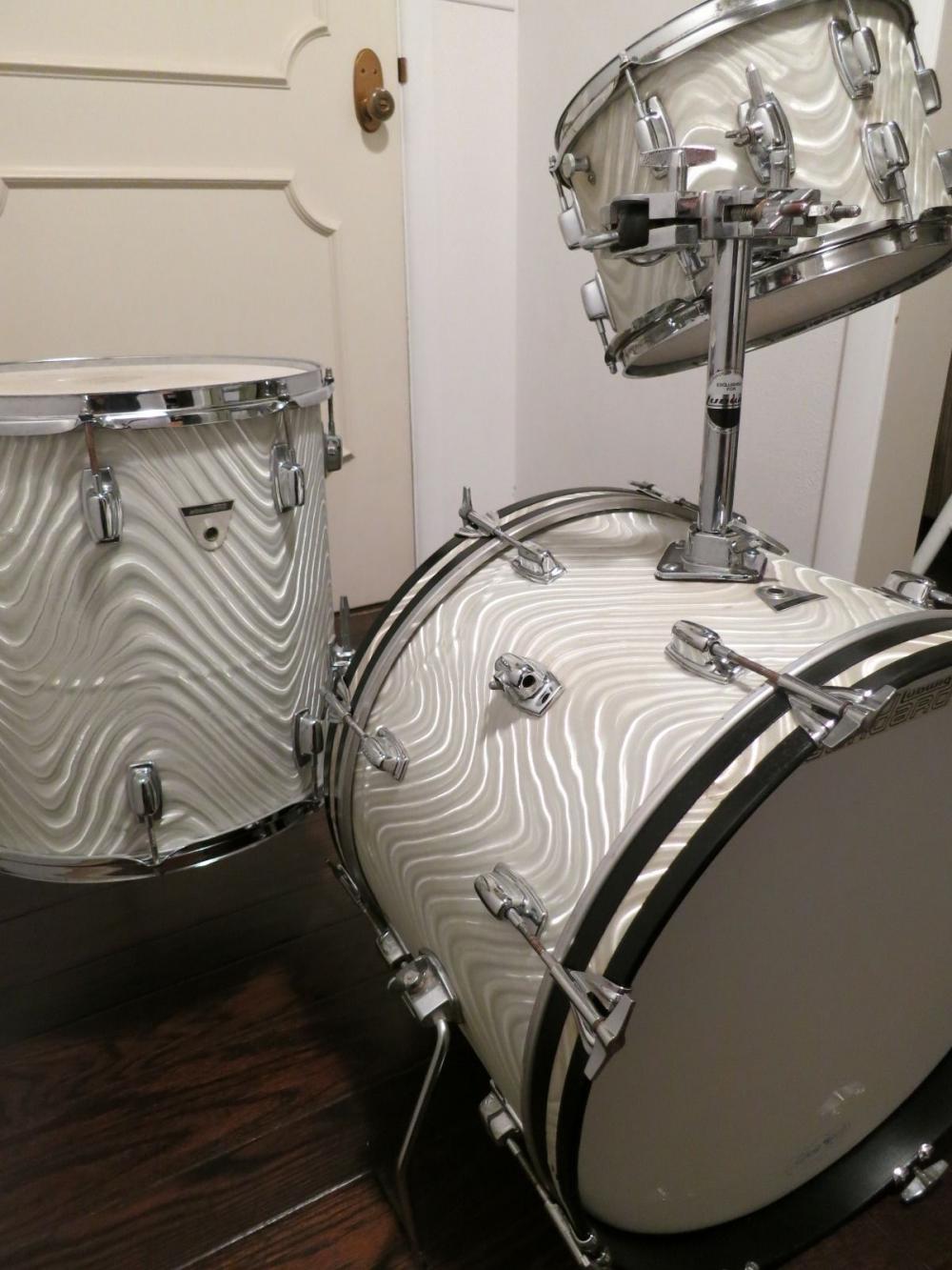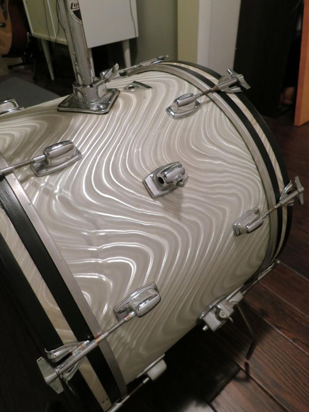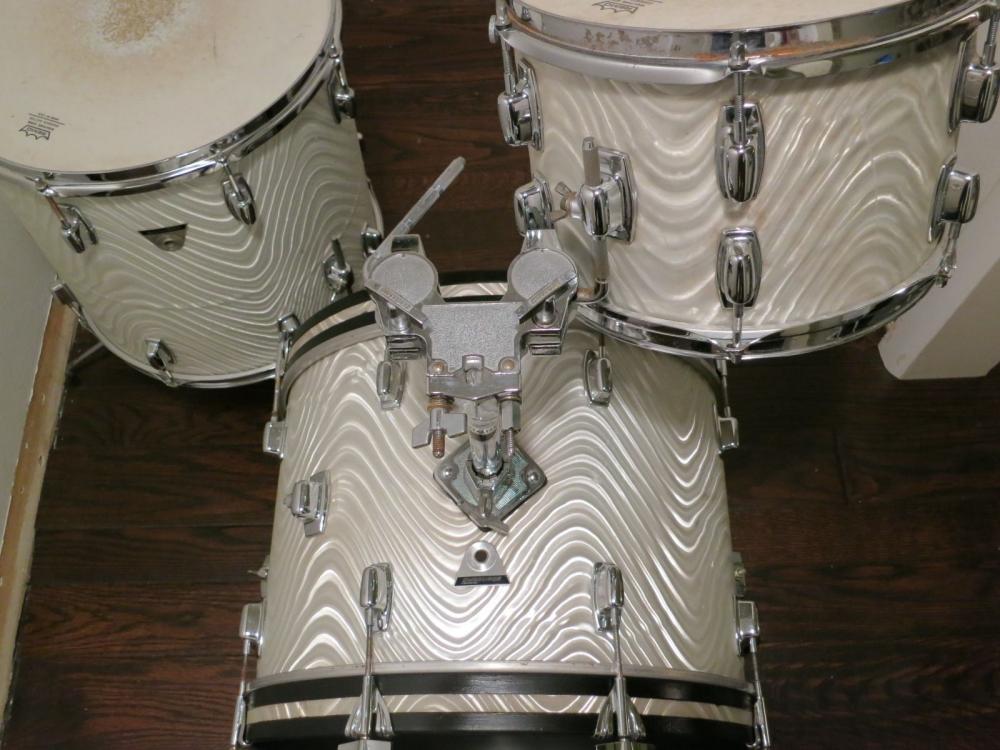 The kit is a 20, 12, 16. It's had the bass drum post changed to a 'Rocker' style at some time in the past... the cymbal mount on the bass indicates the bass drum had been originally designated as part of a single rack tom kit. So, except for the post, it looks quite original...