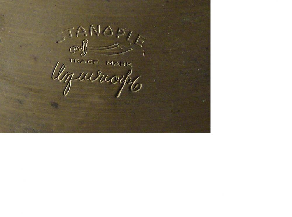 Here's another somewhat unusual pair of stamps. Both stamps are from a 12" Stanople, opposite each other on the front. A nice light cymbal; good as a top hat. Looks late 50's early 60's to me but that's a guess. The Paiste Stanoples I've seen were made in Germany or Switzerland, but this one is Italian (and what does it say underneath the Stanople - Uzuriople??)
