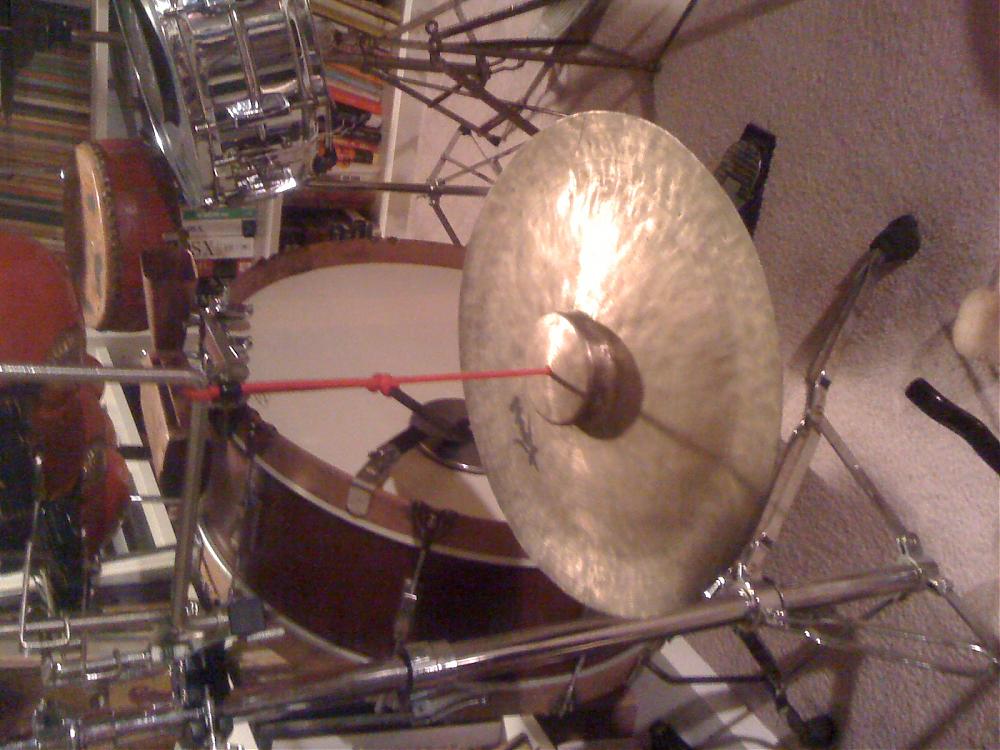 I bought a kit from the 20s with a suspended cymbal stand, so I will be hanging it there when it comes in. I used the cymbal Tuesday at my weekly gig by hanging it from an extra temple block arm I had. My string is a sunglasses strap. Again, I don't know why my pictures are alway rotated 90CCW.