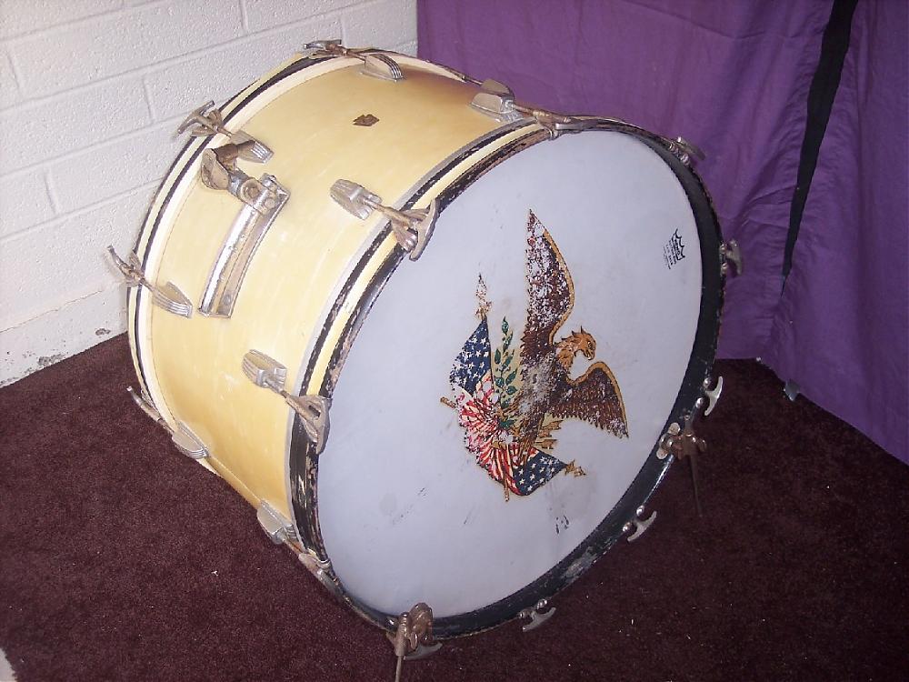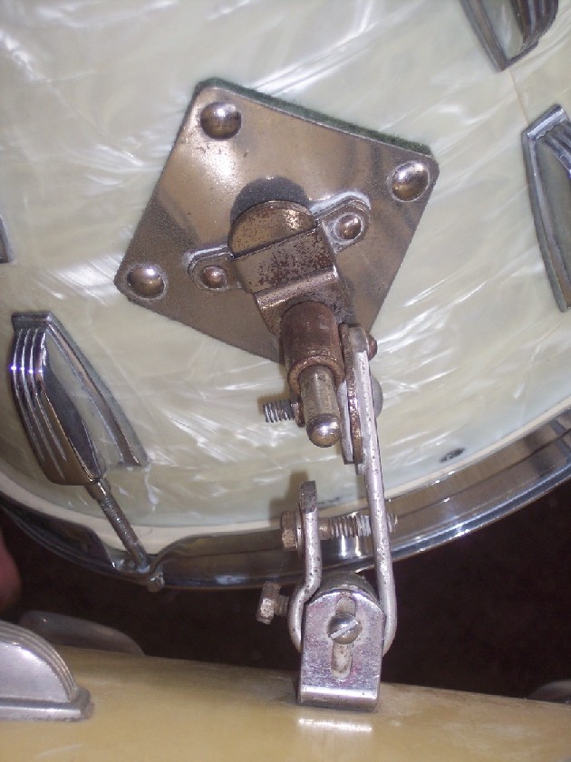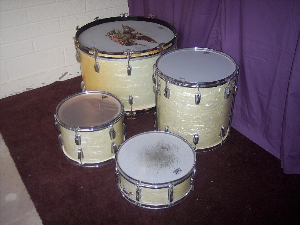 I could see no date stamps inside, and I don't think WFL was using serial numbers when they made this model. All pieces have the brass WFL keystone badge. The bass shell has some sun damage (finish has discoloration, light scratches in veneer) and the shell wood is probably dry from our desert climate in Arizona; all shells have yellowed. The bass shell edge inlay is cracked and much has fallen off one end. Some of the hardware has rust spots and some stands are stiff. I haven't cleaned it, and it could do with some restoration.