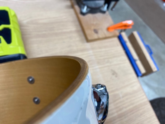I should also mention that the Yamaha double-tom mounts were all in need of replacement. Each one had the nuts being pulled through the casing and not functioning well (see photo). Luckily, Yamaha still makes these with one small difference: They are made in China instead of Japan. Because they are concert toms, they have a different type of mount than typical Yamaha ones. They have blades, like Ludwig used for their concert toms, except the blade has a handy feature: two screws can adjust a plastic wedge to dial in a wobble- and rattle-free fit.