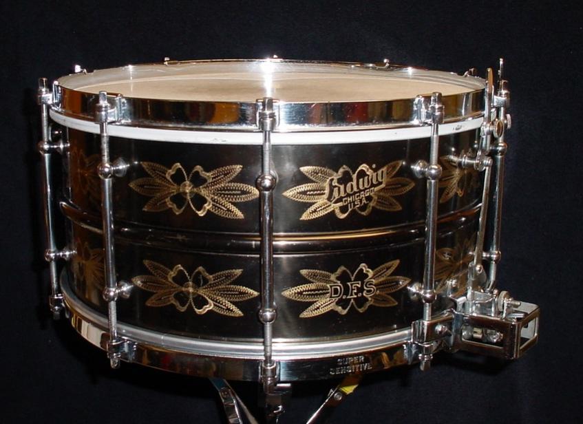 Bill told me to pick out three drums and I couldn’t believe my good luck. I decided on the Tom Mills metal snare drum that started the Ludwig Drum Company, the gold plated and engraved snare known as the William S. Hart Triumphal and this 6.5 x 14 Black Beauty with the letters D.F.S. engraved on the shell.