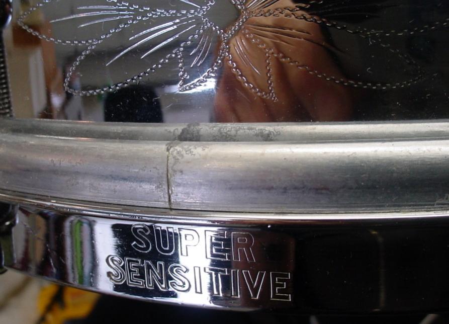 The Super-Sensitive Model was first introduced in 1929 along with the New-Era Sensitive, Standard-Sensitive and Super Power Models. It is generally agreed that the engraved “Super-Sensitive, Standard-Sensitive and Power-Sensitive (bottom rims) and New-Era Sensitive (top rim) signifies 1929. Stamped bottom and top rims of the 4 Sensitive models are thought to be 1930-. This drum is unique in a few ways.