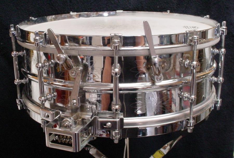 Like most drum manufacturers of the time, Ludwig & Ludwig was very accommodating to their customers regarding special orders. This drum is a perfect example of that type of customer service. It was chrome-plated and then engraved with the 10-point floral pattern. When this instrument was first located there was a question of authenticity. Along with the general consensus that only the Black Beauty/DeLuxe Models had this type of engraving, it was also thought that the drum was chrome-plated after the shell was engraved, which would have made it an “after-market” drum. It was sent to John Wellington, Manager, Process & Materials Engineering at CPI (Communication and Power Industries) in Palo Alto, CA. His findings and high-tech photos proved that the drum is original manufacture because it was first nickel-plated, then chrome-plated, then engraved with the 10-point floral pattern consistent with the era.