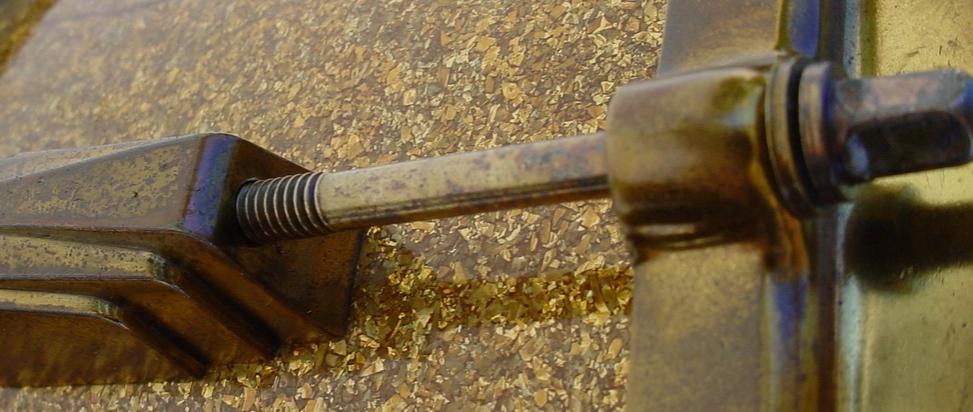 As I mentioned in my Silver Anniversary Black Beauty article Ludwig & Ludwig changed their Artgold (copper plating/gold lacquer) DeLuxe option to the Classic Gold (brass plating/yellow gold lacquer) option in 1932. The Classic Gold hardware is all there, in great shape and only needed a basic cleaning. The 8 tapped Imperial lugs are healthy (no stripping).