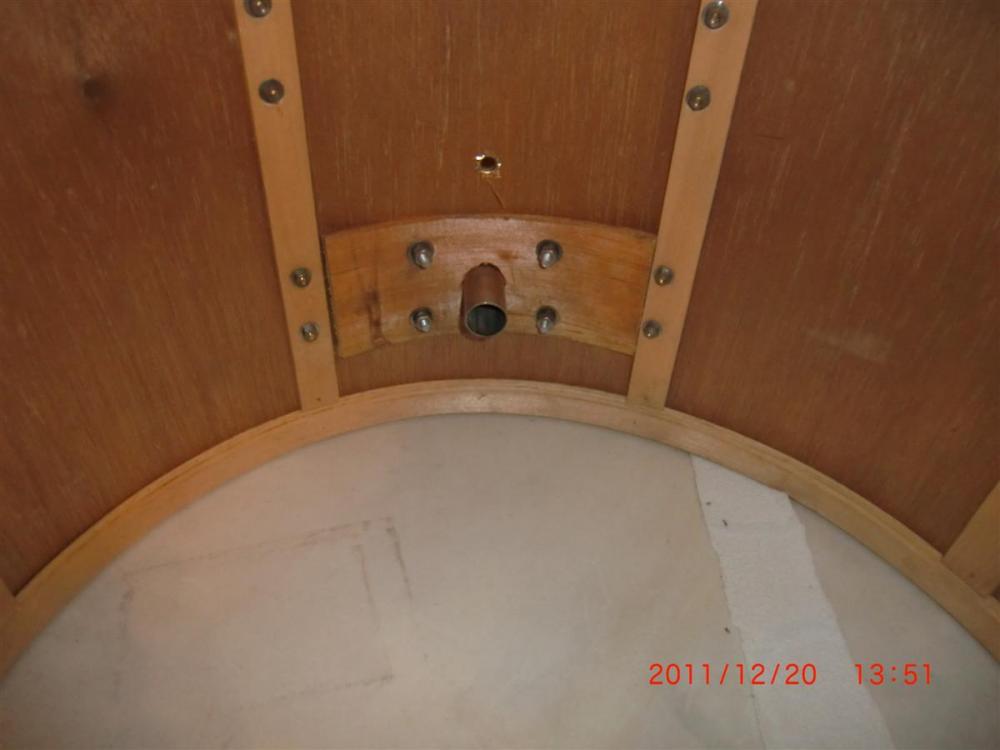 The drum is an odd size - 25 inch diameter. I tucked calfhide on some wood hoops. The drum has beautiful full tone.