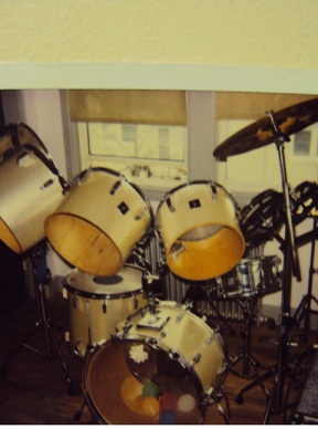 This is a early 90`s polaroid taken the last time I had them up !! (after a birthday party for the bass player...note the balloons inside the bass, I left them inside for about a year) Screw the pillow !!