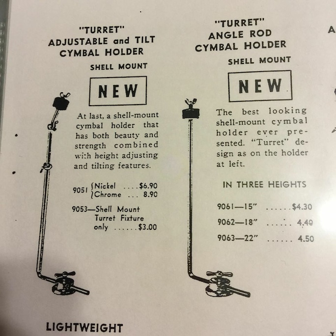 Last year I picked up a beautiful '53 Leedy & Ludwig time capsule kit and during our discussion on the kit here on VDF...we noticed that the cymbal arm mount on the bass drum looked like a George Way/Camco/DW turret lug. Well, last night on the Leedy Facebook group I'm a part of, someone posted a Leedy & Ludwig catalog scan from 1954 that shows my exact cymbal holder setup and it is referred to as a Turret cymbal holder! Mine is the adjustable one on the left. Just thought I would share my newfound knowledge. I would also be interested in knowing if anyone else has ever seen one of these on another Leedy & Ludwig kit. I think it's a pretty rare accessory and it works great, by the way.
