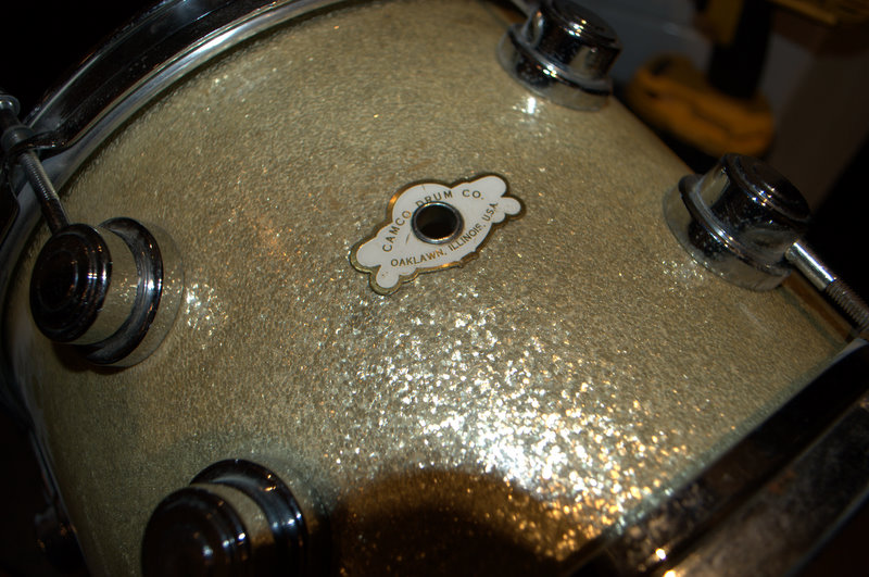 I just came across a Camco kit and not knowing a lot I bought it. I now realize it's a lot older than 1975! Anyways it gold sparkle 20/12/16 and it appears in pretty good shape minus the Rogers memory lock someone put on it years back. It has white painted interiors and super wide rerings. I just noticed the bass drum is missing a few lugs. The badge says Camco Drum Co. Oaklawn Illinois and is similar to a cloud badge. Any ideas on the model and shell construction of this kit? Would it be worth restoring as I know parts for these appear to be scarce. Also any idea of a year and what would be an approx. value? The floor tom is perfect but the tom(drill for rogers mount) and bass drum need some attention.