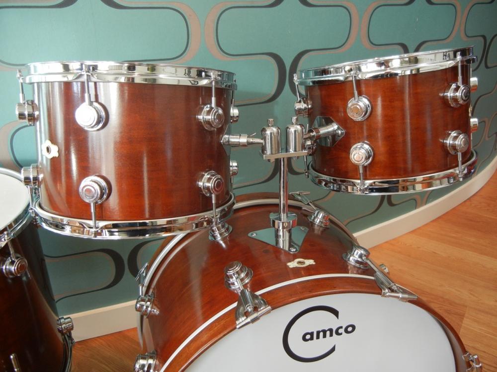 Allow me to share some pictures of my latest project. Thanks to a forum member, I was able to buy this mid/late sixties 22,16,13,12 Oaklawn set. It took me a while to find the missing parts and get the restoration going. A couple of extra holes had to be plugged and especially the bass drum top section needed a lot of work as it was drilled (molested) for a 70's Premier tom mount system. I decided to go for the typical Camco wood finish instead of the more obvious wrap solution. See it as a tribute to the work of the great Jim Gordon and his iconic Walnut Camco kit. (same finish, same sizes, same shells) The steel hoops are not original and tone-controls are missing. The positive is that the edges are perfect and sound-wise, it's everything you would expect from a 6-ply Jasper Camco kit. I attached some before and after shots. I hope you like the result.