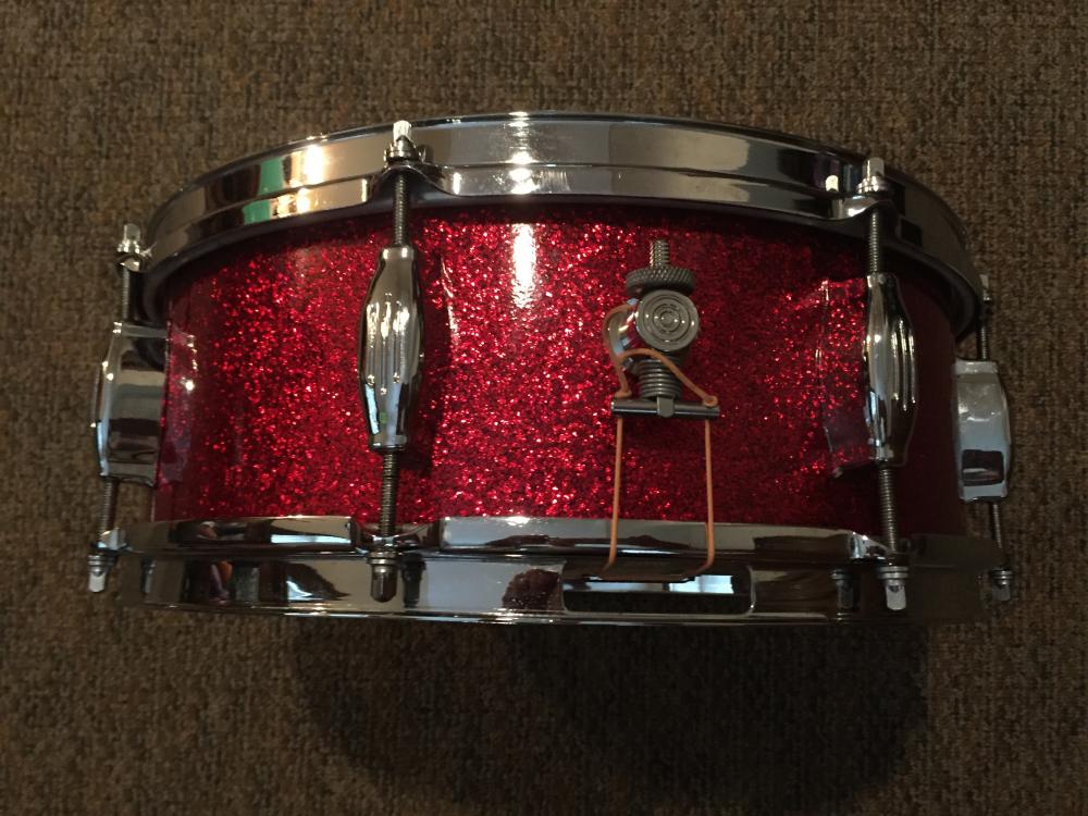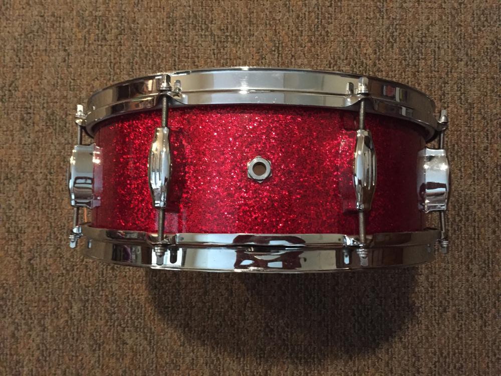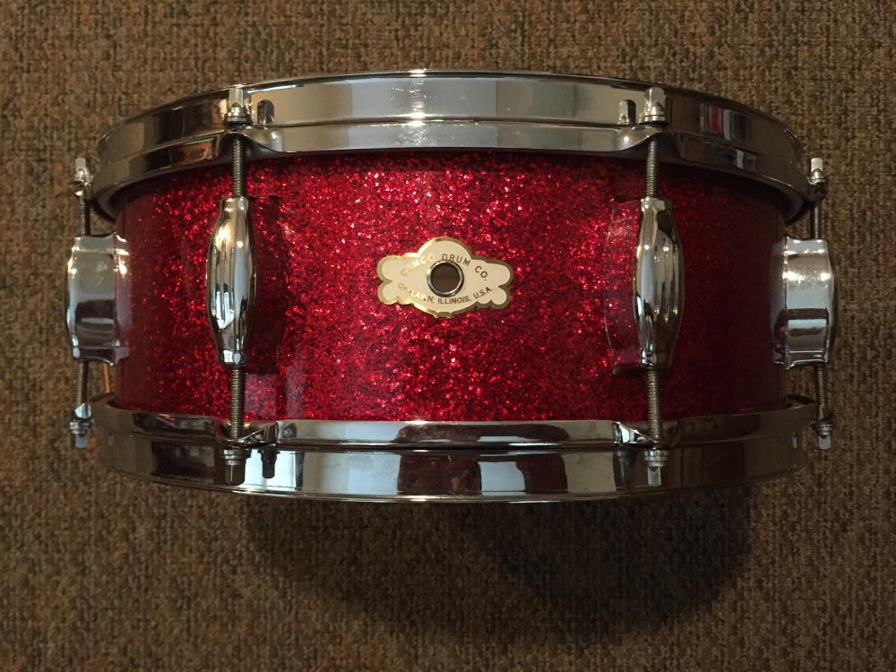 1960s Camco snare drum in vibrant, original red sparkle. This vintage 5x14 drum is the Studio model -- a sweet sounding drum and a true workhorse, with 8 Tuxedo lugs, Camco hoops, built-in key holder, and 'beer tap' strainer. The inside features the factory white paint and is super clean, as are the bearing edges. The chrome is gorgeous. A classic drum and an exceptionally clean find. $450 plus shipping.