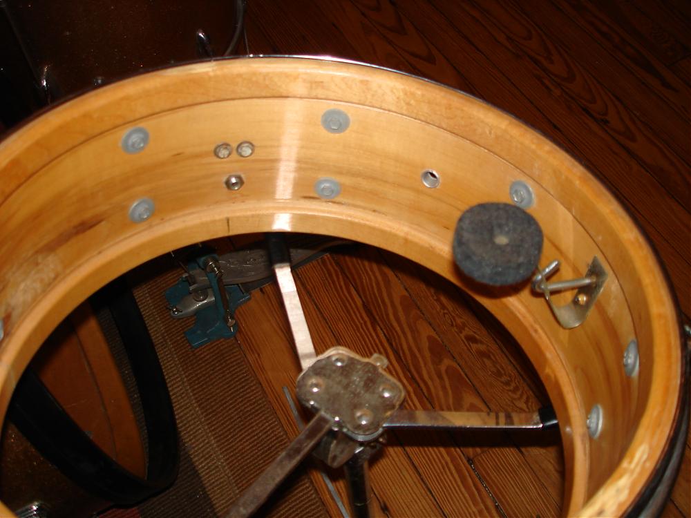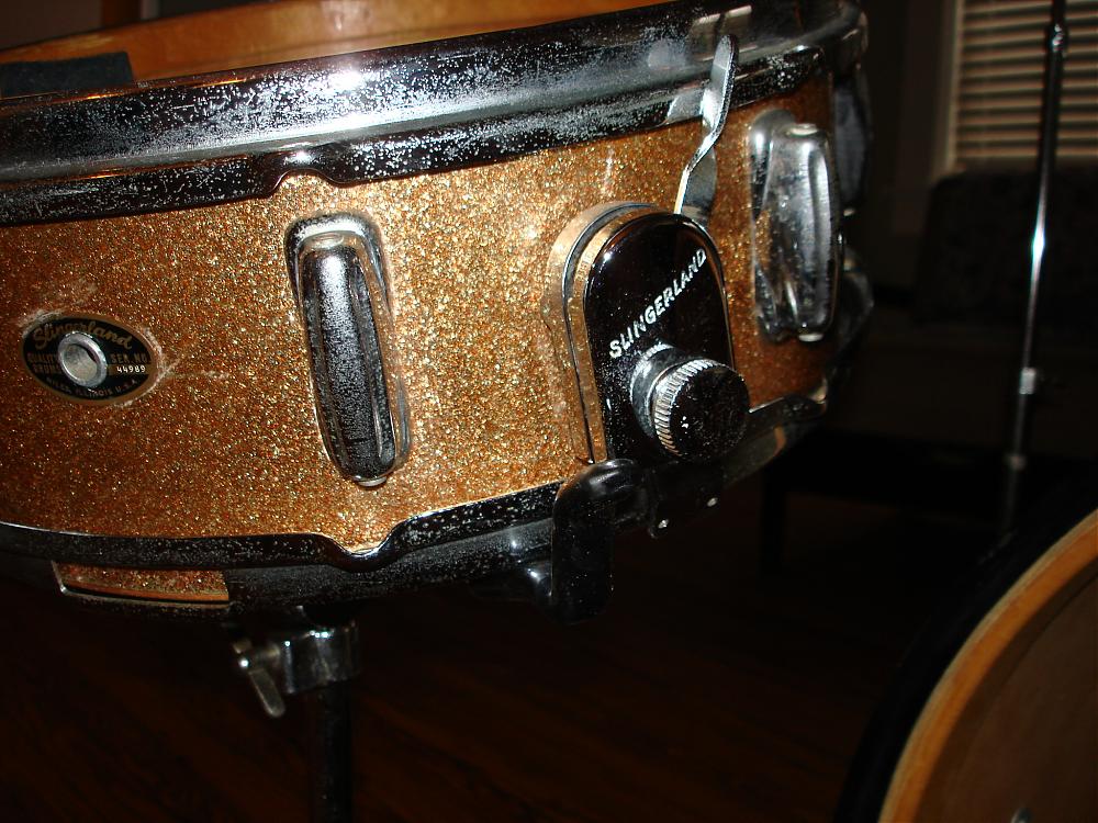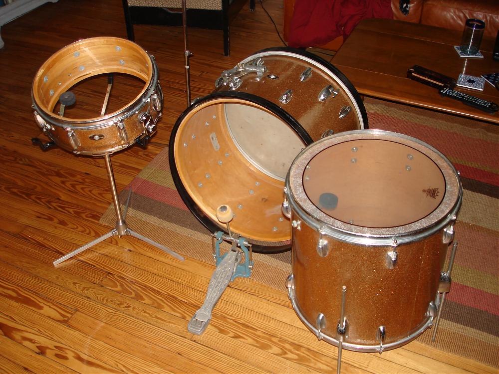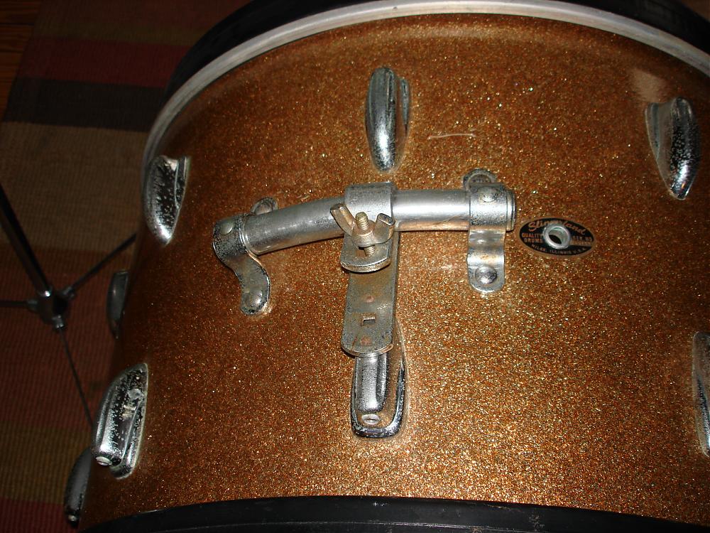 Pick up a 1965 Slingerland kit in Champagne sparkle! From the pics you can obviously tell I am missing a few things, so I am on the hunt. The wrap is in mint condition with only one little deep scratch in the bottom of the bass drum.