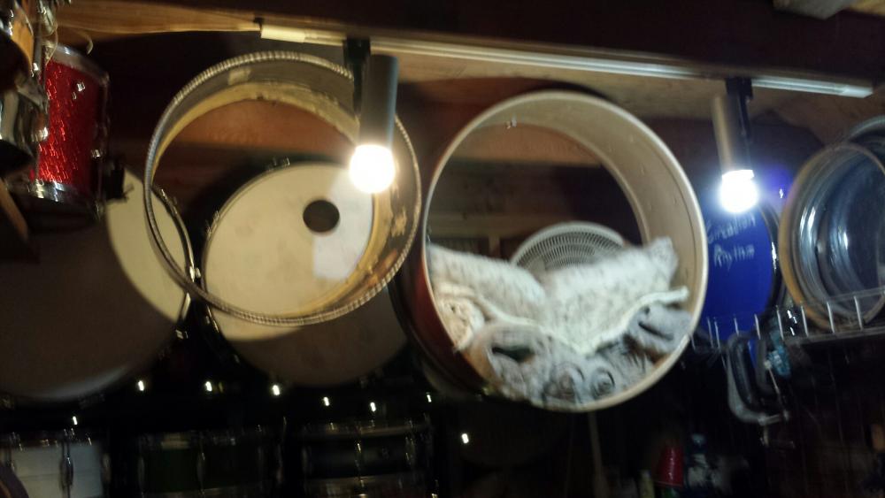 I actually saved all the fur. I was thinking once I am done re-furbishing the Slingerland kit, I wanna cut the fur and place it on the front head. I think it would be slightly comical, slightly cool, and a good hommage to what the kit once was. I have it all wrapped and stacked inside the monster 28" bass drum hanging from the ceiling.
