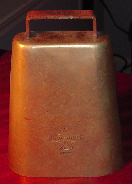 Hi Kevin,I think I may have the cowbell you're looking for. I've attached a photo of what I have; it's a bit tarnished, but I think it will clean up nicely. There are no dents and it has a script logo with 'Chicago' stamped below it between the tails of the 'L' and 'G'. Let me know if this is the bell you're looking for...Thanks!Randy