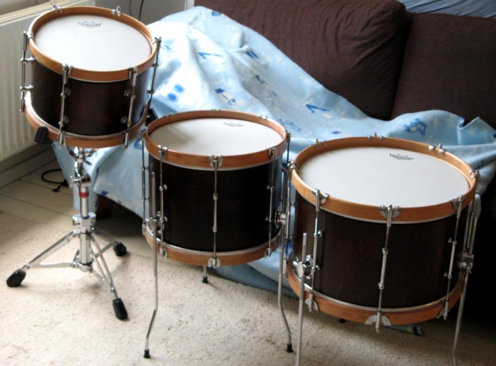 Bass drum allmost ready but waiting for a decent hoop, which will take a while. I'll post pics in the gallery when set is complete.