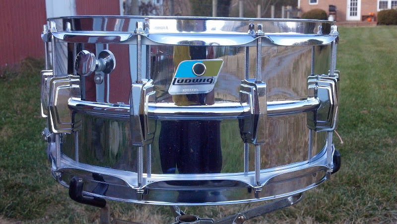 SOLD Ludwig 402 14 x 6 1/2 Supraphonic "Bonham" snare drum No. 2020625, round blue/olive badge; $450 SHIPPED in lower 48