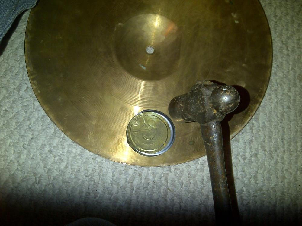So, I decided to try to fix it permanently. First, I was not afraid to get the hammer out as they were truly useless because of the dents. I did not want to just use a hammer because that would likely just create another small dent. So, in order to spread out the impact, I used 3 can lids stacked together in the center of the dent (which was about the size of a baseball or the size of a fist). I first started by placing the cymbal on the couch - which proved to be too easy on the cymbal and unfortunately it made no change. So, I then decided to lay it right on the carpeted floor. That helped - and pretty much did the trick. I was not afraid to really give it a wack though.