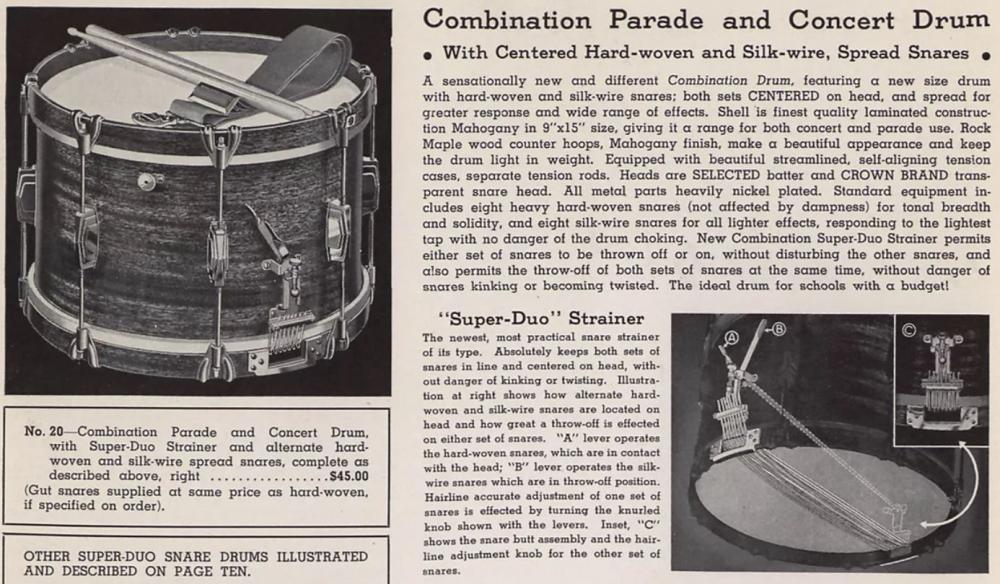 Never saw or heard of this before to my recollection, but for something apparently designed for use as a school drum I don't think the snare design was thought out well. From my experience back in Junior High School bands in the late '50s, the moving, storing, and handling of school percussion gear by students was too rough for a delicate looking snare system like that to survive very long. Even in high school something like that would have eventually gotten broken. I'm guessing Ludwig got the message very quickly and stopped making them.
