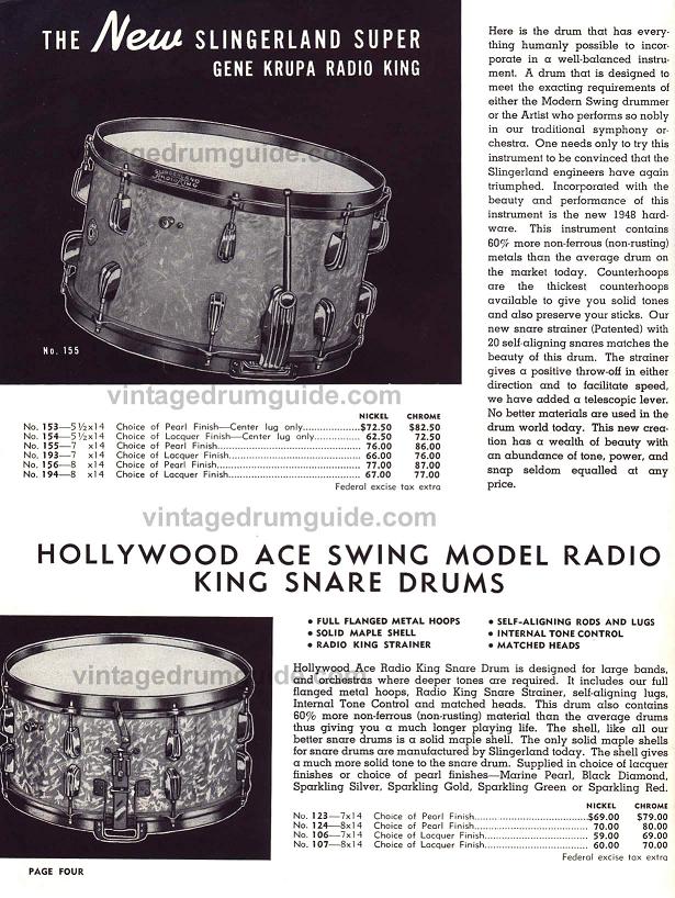 Here's the cat page from '51, showing a deeper depth Gene Krupa Radio King with individual lugs, and specifying center lugs for the shallower 5.5 inch shell.