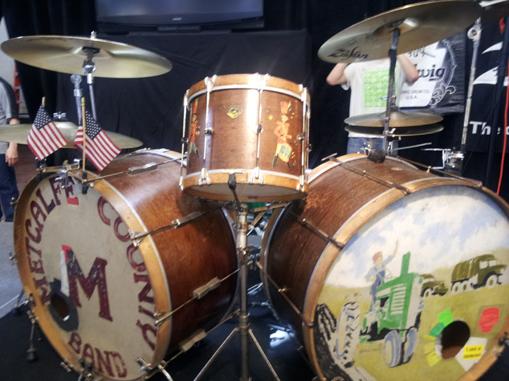 I was wondering if anybody has tried to do this before and I figured this might be a great place to ask this question. I am putting together a 20's - 50's mahogany kit, which will be a mix of various makes - very much like Fred Young of the Kentucky Head Hunters. The kit will have (2) 14x26 bass drums (Ludwig Pioneers), a 12x15 marching/field snare converted into a floor tom (WFL), a 12X17 marching/field snare converted into a floor tom (WFL), and (2) 14" marching/field snare drums used as rack toms cut down to 8x14 and 10x14 respectively (Slingerland). My question is this - has anybody here ever created a double rack tom stand using two snare baskets? I want to go this route as opposed to adding mounts to the two rack toms. Just curious.... Just so you know what the kit will look like, I've attached a picture of Fred Young's kit for reference. Mine will be almost identical except I will have two rack toms.