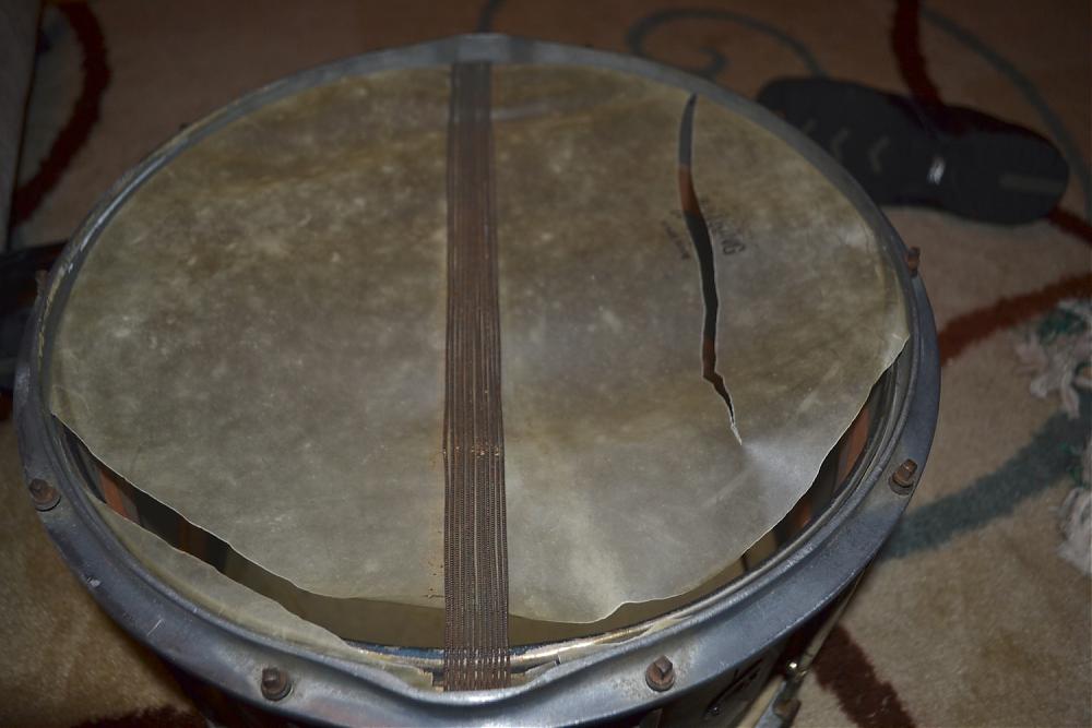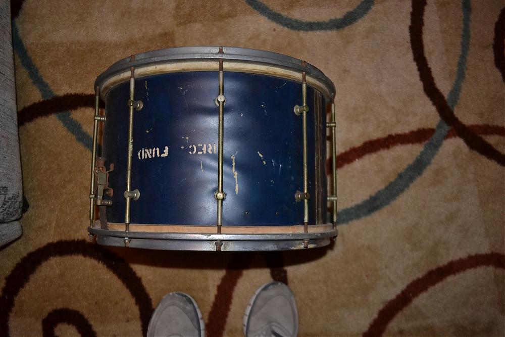 This drum is pretty beat up but appears to be all original. The top and bottom heads are busted. All the hardware is there including the snares. I think it was built in the 20's or 30's. The bottom head which is busted has the Radio King Parade Drum logo on the head. It looks like someone painted the wrap blue at some point because there is some overspray inside of the drum. Need to get rid of some stuff. If anyone is interested make me an offer.