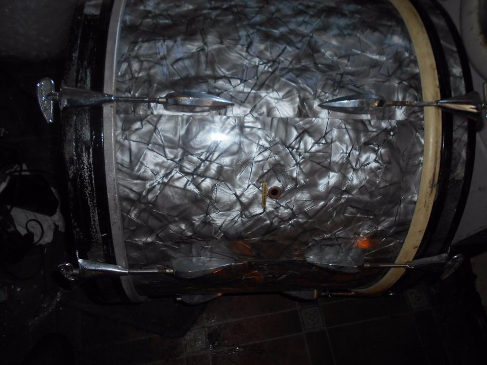 The front bass drum head is the original calf skin and logo (NOT a sticker)