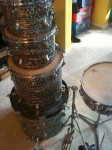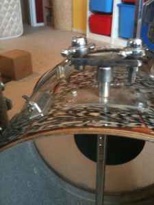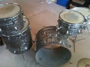I even offered a trade of a 70's Dyna and some cash but he said no. He wants the cash for taxes. I just can't justify throwing that kind of money at this thing in the condition it is in. A matching bass drum hoop will be tough to find. I considered doing a re-wrap on the whole kit but it sucks to knock out a rarer finish like that on the fact that the bass drum is messed up.