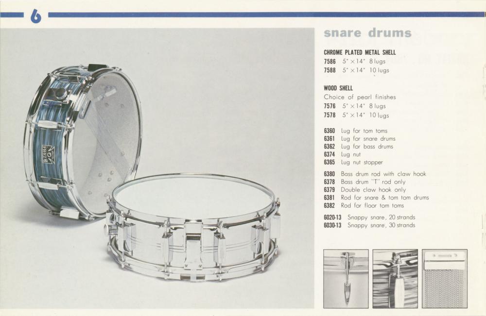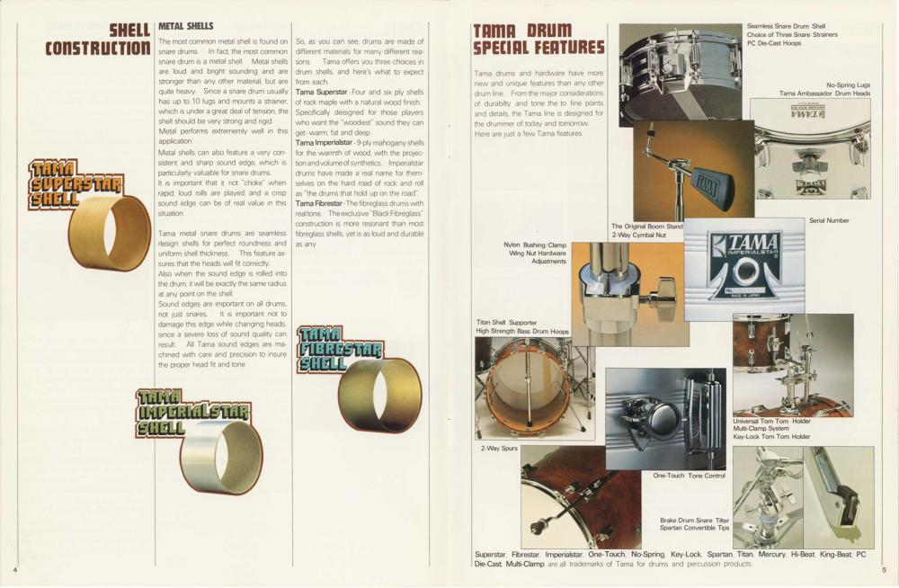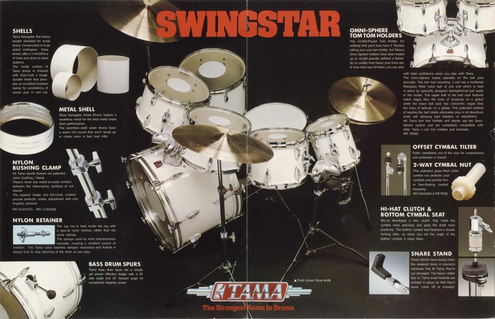 The first line of drums under the Tama name were Swingstars. Followed by Imperialstars,Royalstars,Superstars, and Fibrestar. Until the mid '80s these were the lines. Now here is where the fun begins. When Tama introduced the Imperialstars they were the flagship high end. In '74 the Swingstar & Royalstar lines were being made using '60s hardware ( rail mounts,off set lugs, single center lugs ) I can only assume there was still some demand for kits such as that. But in '75 the Royalstars featured modern hardware - yet had the exact same shells as the Imperialstars. Now in '77 the Swingstar drums had the same shells as both Imperialstar & Royalstar and even had the same lugs as the Royalstar. The only difference was the name. They were the exact same drums. This was true until the mid '80s when they stopped making Imperialstars,Royalstars,Superstars in favor of Artstars, Granstars, etc... That is when the Swingstar became the bottom line of Tama drums. I am including a few photos from catalogs to show this. Also a link to look through Tama catalogs from the '60s until today. You'll also notice the descriptions of the drums are basically the same. This makes things very confusing as until the Superstars all their lines were more or less the same with slight feature differences. Here is the link to all the catalogs -
