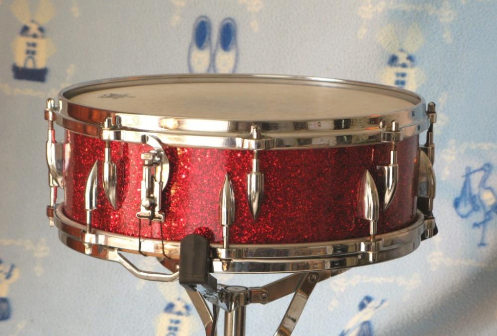 This snaredrum was originally a marching drum that I bought cheaply. I converted it and gave it a red sparkle finish. For proces see: http://vintagedrumforum.com/showthread.php?t=49341