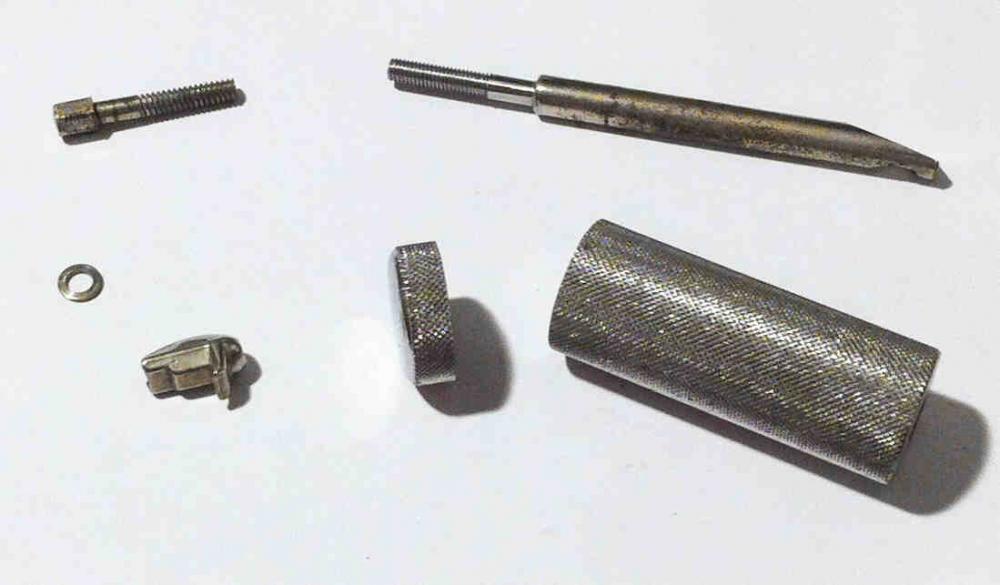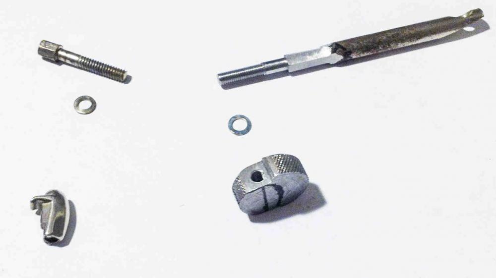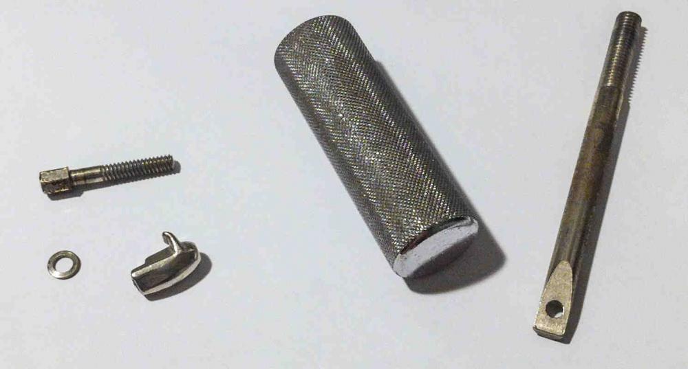 First steps: the original screw has (I assume) 3/16" BSW thread. But I have only metric possibilities, so M5 was the next possible thread size for me, which I have cut out from the tension part, and I also cut out a slice of the boomweight, foreseen for the 'nut'.