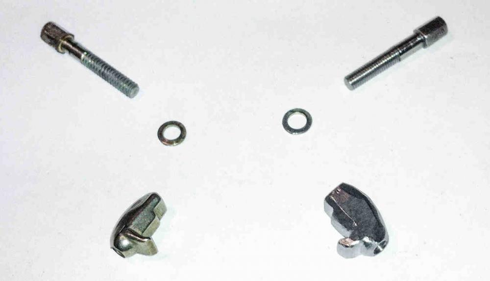 Original parts on the left and the raw material (a former counterweight from a cymbal boom arm and a tension part of a German drum used in playgroups) on the right side. From both I will carve out the replica parts.