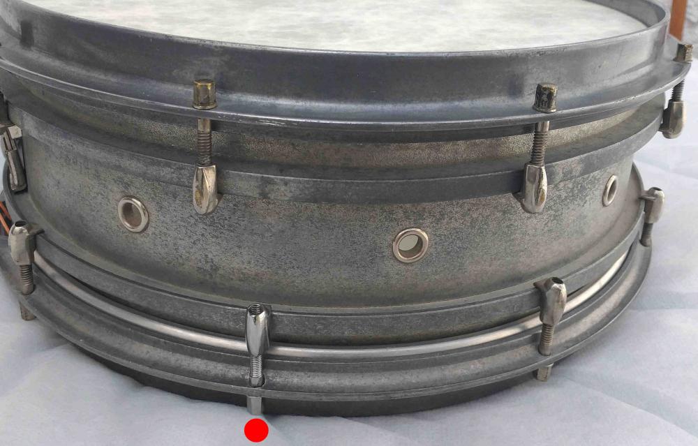 This is the snare drum with the missing tension screw and 'nut' part at the bottom hoop.