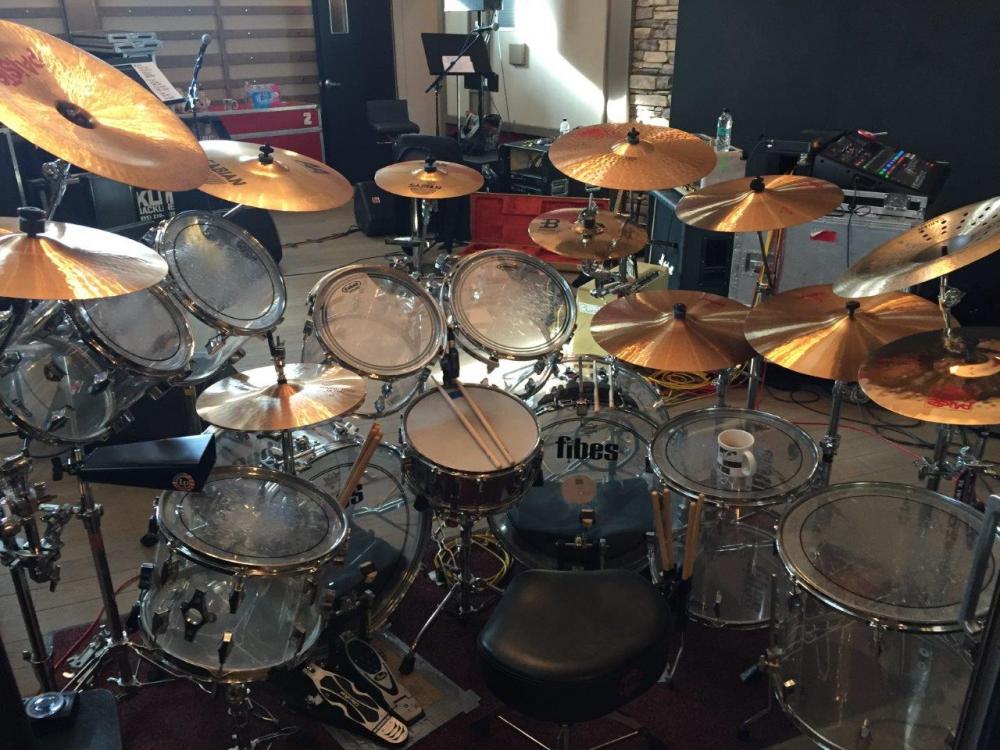 Cymbal set up from my left is 16" Paiste 2002 medium, Paiste 2002 20" China, 15" Paiste 2002 Sound Edge hi-hats, 17" Sabian AA Medium Crash, 12" Sabian AAX Splash, 14" Meinl Soundcaster sound edge hi-hats, 19" Paiste 2002 Rock Crash, 18" Paiste 2002 Medium, 20" Paiste 2002 Ride, 21" Paiste 2002 Medium, 19" Sabian Holey China, 17" Paiste 2002 Wild Crash.