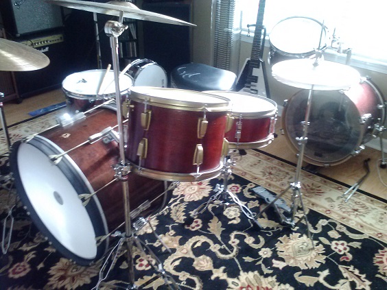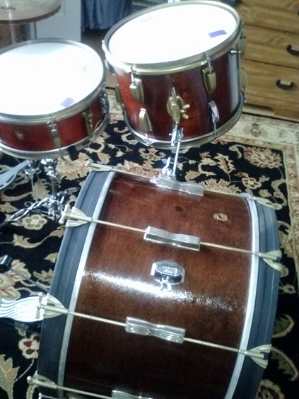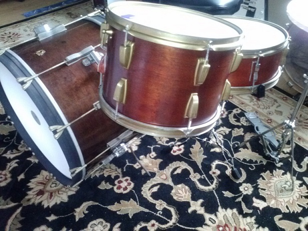 I posted back in May, about the good neighbor who gave me a drum set for free...otherwise it was going to the dump!..so I save a Ludwig USA kit. Early 60's. Included hi hat stand, cymbal stand. After a month of restoration....stain, laquer, heads, etc...got it where I want it...Had a ball playing it today..on the 4th.