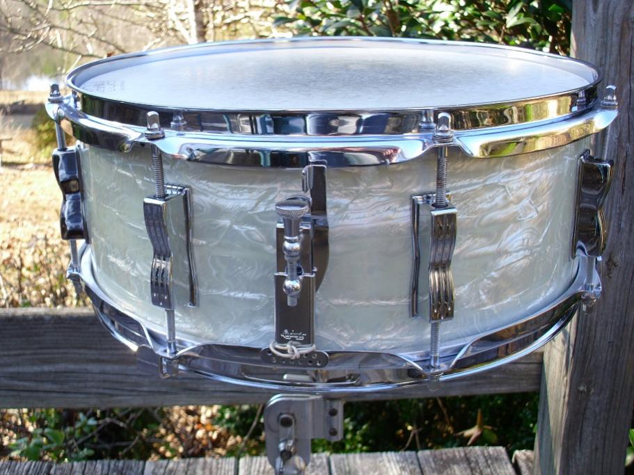 This is THE nicest Jazz Festival that I have ever come across. Collector grade all the way. This is a May 4 66 Ludwig Jazz Festival in vivid White Marine Pearl. This 3 ply beauty is completely original including heads,18 stand wires and snare cords. Wrap is stunning/flawless. Hardware is near perfect. P83 strainer is super smooth. Serial number is 260541. Reso head has a small 1/4 tear near edge. Drum sounds incredible. I would keep it as is but will include a new Ludwig snare side head for you. Will install prior to shipping if you desire. Please pm me here or email to [email]mikelayton@bellsouth.net[/email] if you have any questions. Thanks...Mike.