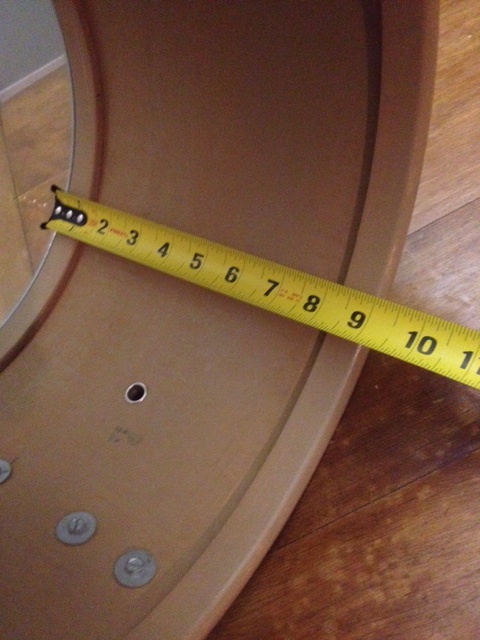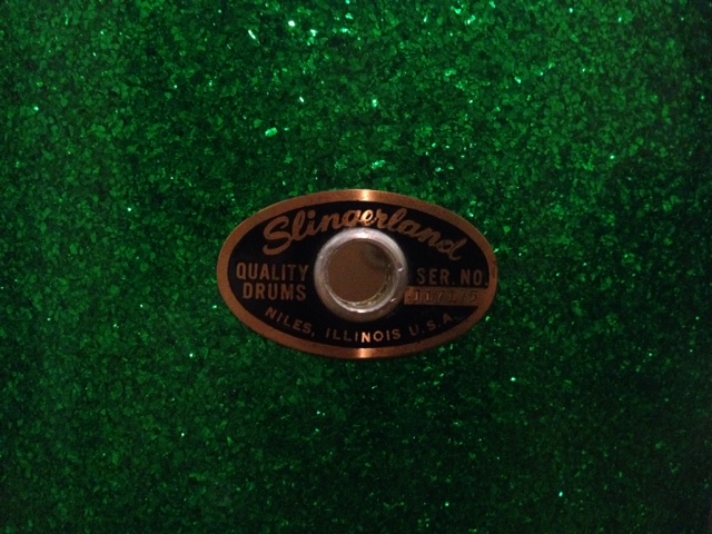 This is a late 60s Slingerland - see the chocolate milk interior - 9x13 tom in original green glass (sparkling green pearl, actually). The hoops and rods are not original and the muffler is missing. The diamond plate mount is present and in good condition. The drum itself and the wrap are in beautiful original condition with no extra holes and only minor scuffs.