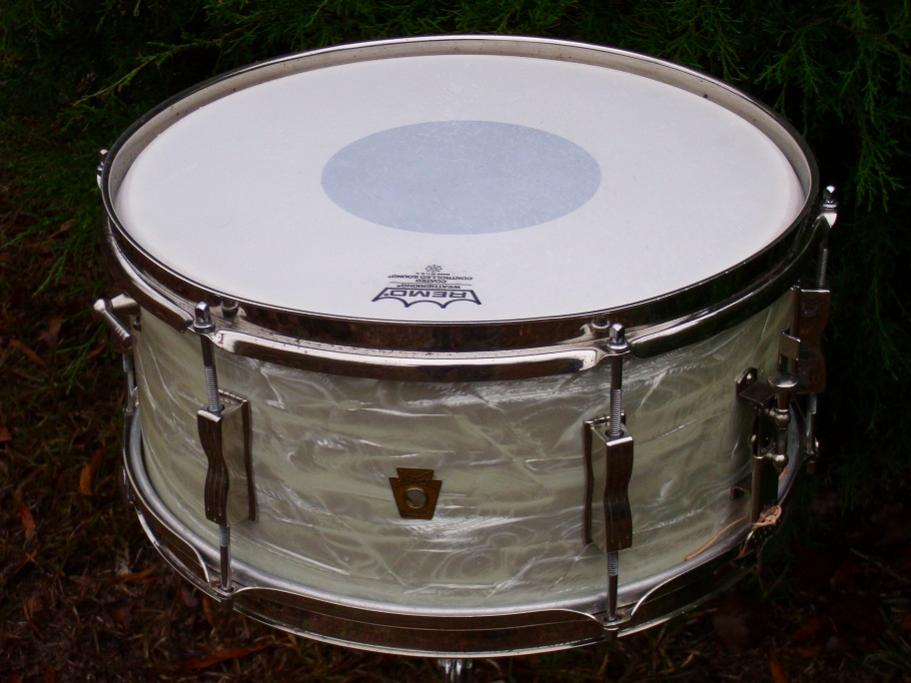 This is one you don't see everyday. This is a May 4th 1964 Ludwig 6.5x14 6 lug Pioneer model in White Marine Pearl. Serial number is 32366. This 3 ply drum has the classic warm sound of the 60's Ludwig wooden snares. The extra depth really adds a nice bonus to the sound. The wrap is beautiful. It's not snow white and it's not faded much. It's the perfect shade of creamy WMP that I love. Matched all of my drums well. The wrap has no issues. Has beautiful bearing edges and white resacote interior. The drum has nickel hardware. It came to me a few years ago with chrome tension rods and I honestly never noticed until I detailed it this week. Has P83 strainer and Ludwig script logo snare butt. Wires are Ludwig 20 strand metal with Ludwig cords. Nice Remo Coated Controlled Sound head on the batter and a Remo Ambassador on the snare side. Red felt bat muffler works great.[COLOR="Blue"]*[[/COLOR] I've owned 3 '64 Pioneers that have all had original nickel over steel hoops. This one is the same. Even the drop gate on the snare side hoop makes you think brass. But this is a transitional trait of this time. There is some corrosion on the hoops that would clean up even better with a little elbow grease.[COLOR="Blue"]][/COLOR] I've really enjoyed this one, but sadly need a new home for it. Hope one of you can put it to use in your arsenal. Please feel free to pm me here or email to [email]mikelayton@bellsouth.net[/email] if you have any questions. Thanks for checking it out.